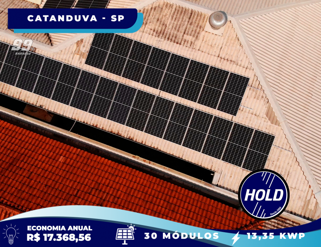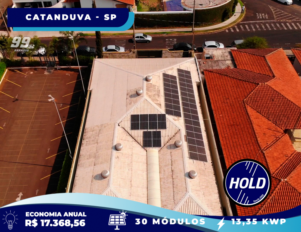 Com um sistema de 30 módulos fotovoltaicos, instalado no Centro de Catanduva, você pode gerar 20.196 kWh por ano de energia limpa e renovável. Com uma potência de 13,35 kWp, essa instalação proporciona uma economia anual estimada de R$ 17.368,56 na conta de luz.